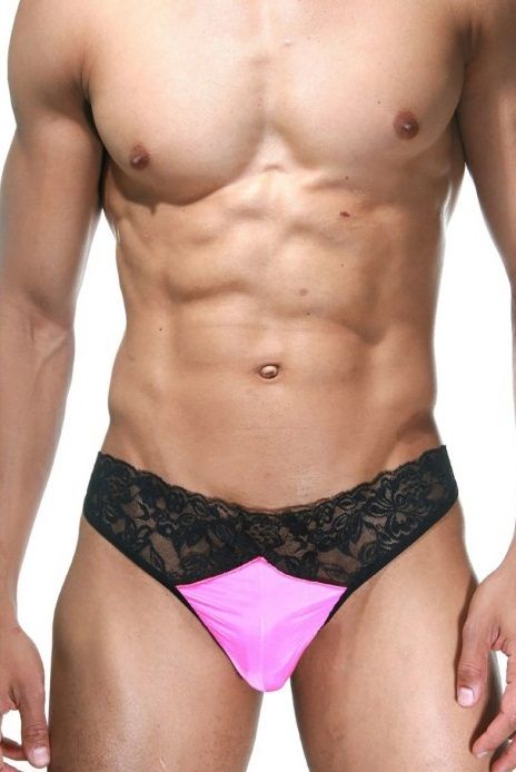 Танга для мужчин, с кружевным полотном на ягодицах и поясом, и розовым, эластичным материалом в районе мошонки.