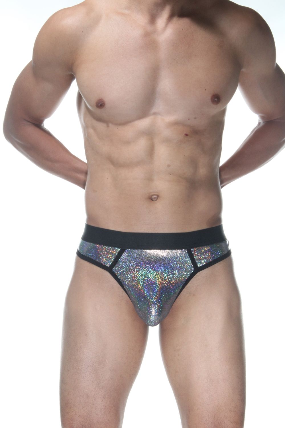 Серебристые блестящие мужские трусы-стринги.