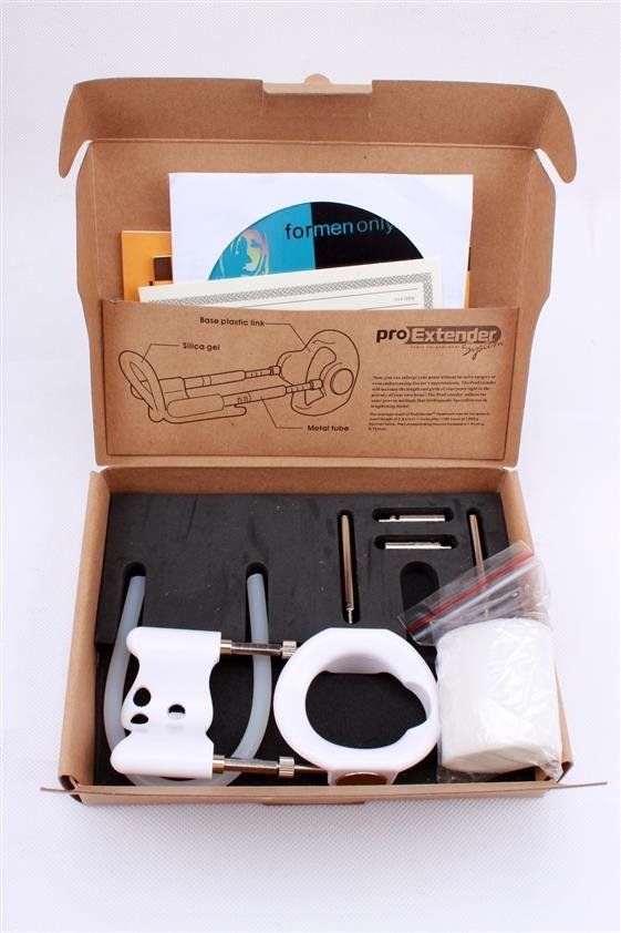 Экстендер для увеличения пениса. В комплект входит: экстендер с пружинными штангами (увеличение пениса до 20 см), удлиняющие стержни, гибридная насадка, силиконовый жгут-фиксатор, смягчающая прокладка, упорное кольцо с пружинным механизмом, DVD-инструкция.