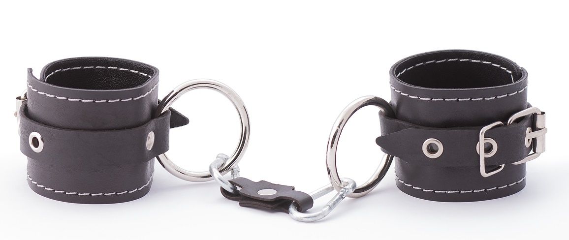 Кожаные двухслойные наручники имеют регулируемые застежки. Наручники имеют кольца для крепления и металлическую сцепку. Ширина манжет - 5,5 см. Длина манжет - 20 см.