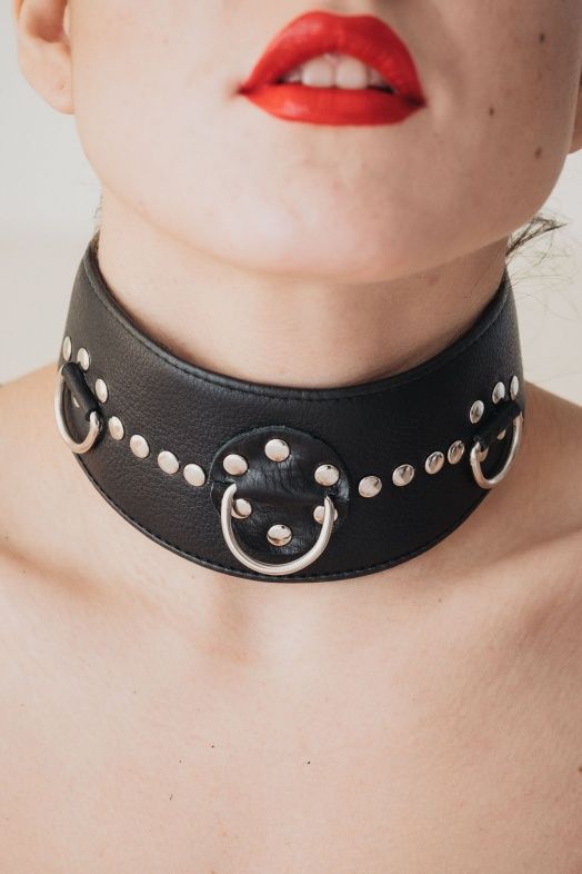 Чёрный кожаный ошейник с полукольцами и клёпками.