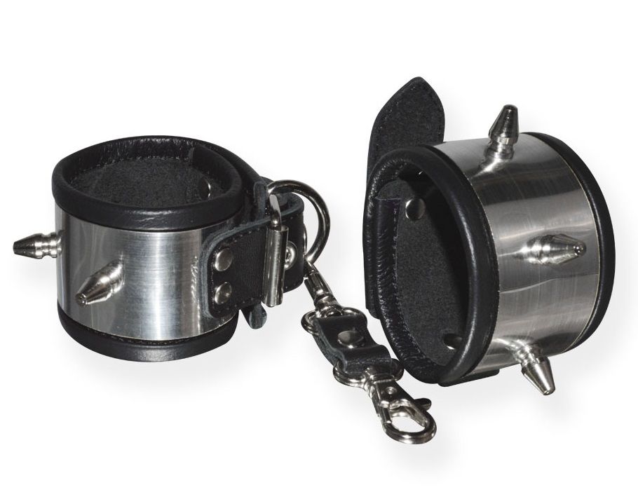 Серебристо-черные наручники с шипами и металлическим блеском.