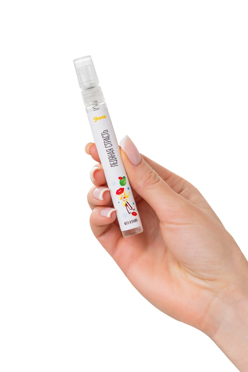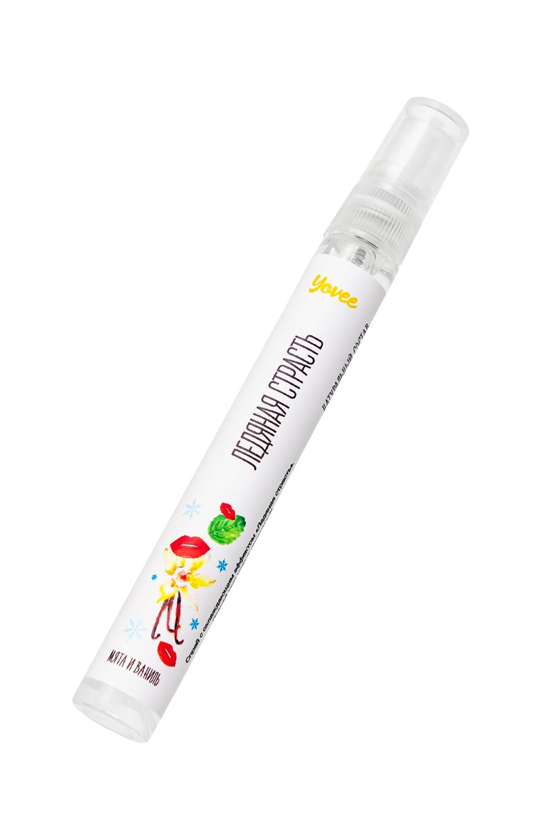 Обладая соблазнительным мятно-ванильным вкусом и приятным охлаждающим эффектом спрей Yovee «Ледяная страсть» усиливает удовольствие от секса и делает интимную игру еще более пикантной. Современные исследования подтвердили, что сладкий и теплый аромат ванили вызывает выработку эндорфинов (гормонов радости), тестостерона и других гормонов, способствующих сексуальному влечению. Мятный аромат поможет сбросить груз проблем, привести в порядок нервную систему и, следовательно, быть готовой в полной мере проявить свою чувственность при встрече с любимым человеком. Применение спрея притупляет рвотный рефлекс и помогает освоить технику глубокой глотки. Также спрей можно использовать для усиления чувствительности нервных окончаний сосков. Под воздействием активных компонентов восприимчивость эрогенных зон станет выше, а ласки еще более приятными. Распылять средство нужно непосредственно перед оральным сексом. Длительность эффекта зависит от количества нанесенного спрея. Активные ингредиенты: Ментол - основной компонент эфирного масла, содержащегося в листьях мяты перечной. Избирательно раздражая холодовые рецепторы, вызывает ощущение холода, жжения, покалывания с последующим небольшим понижением чувствительности. Эфирное масло эвкалипта - афродизиак мягкого действия. Повышает сексуальную энергию, вселяет уверенность, придает силы, восстанавливает утраченные силы. Благодаря свойству эвкалиптового масла подавлять канцерогенные оральные бактерии, его часто используют в средствах для освежения дыхания и оздоровления полости рта. Натуральное эфирное масло мяты и масляный экстракт ванили усиливают возбуждающий эффект.