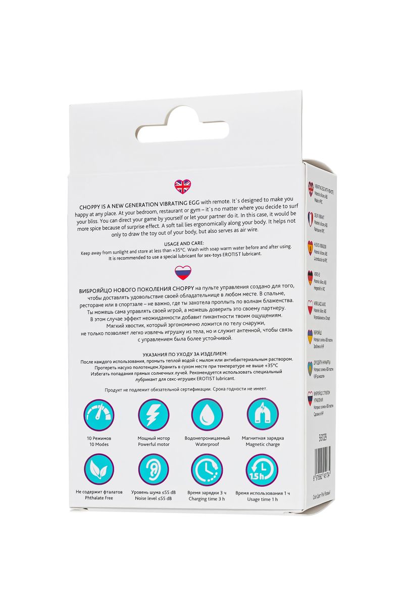 Виброяйцо нового поколения Choppy от L’EROINA на пульте управления создано для того, чтобы доставлять удовольствие своей обладательнице в любом месте. В спальне, ресторане или спортзале – не важно где ты захотела проплыть по волнам блаженства. Многофункциональное виброяйцо Choppy поможет пробудить спящую чувственность, разнообразит отношения в паре и добавит ярких ощущений в повседневную жизнь. Игрушка обладает мощным мотором и 10 режимами вибрации, с которыми ты познаешь все 33 удовольствия на пути к седьмому небу. Ты можешь сама управлять своей игрой, а можешь доверить это своему партнеру с помощью дистанционного пульта управления. В этом случае эффект неожиданности добавит пикантности твоим ощущениям. Мягкий гибкий хвостик эргономично обнимает тебя снаружи, не доставляя дискомфорта. С помощью него ты легко можешь извлекать игрушку из тела, а кроме того, хвостик служит антенной, чтобы связь с управлением была более устойчивой. Почти невесомое виброяйцо будет отличным спутником в путешествиях – его вес всего 83 грамма. Шелковистое бесшовное покрытие из силикона делает использование игрушки не только гигиенически безопасным, но и тактильно приятным. Чтобы испытать весь спектр удовольствия, возьми игрушку с собой в душ, ванну и бассейн. Водонепроницаемость уровня IPX7 позволяет получать удовольствие в воде до 30 минут. Choppy предлагает вместе расширить границы возможностей с приложением Love Spouse. Работа приложения осуществляется в тестовом режиме и может быть нестабильна. Перспективная функция управления Bluetooth через смартфон дает игрушке возможность вибрировать в такт музыке, реагировать на движения смартфона и рисунки на экране, и даже обеспечить присутствие партнера независимо от расстояния (в том числе текст, голос, видеовызов или запрос на управление устройствами друг друга). Рабочая длина - 10 см.